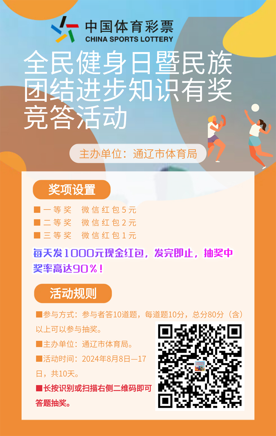 2024年8月5日,通遼市大尚網(wǎng)絡技術服務有限公司與通遼市體育局達成合作協(xié)議,大尚網(wǎng)絡公司負責通遼市體育局“全民健身日暨民族團結(jié)進步知識有獎競答活動”系統(tǒng)開發(fā)制作工作,活動正在進行中,敬請期待。